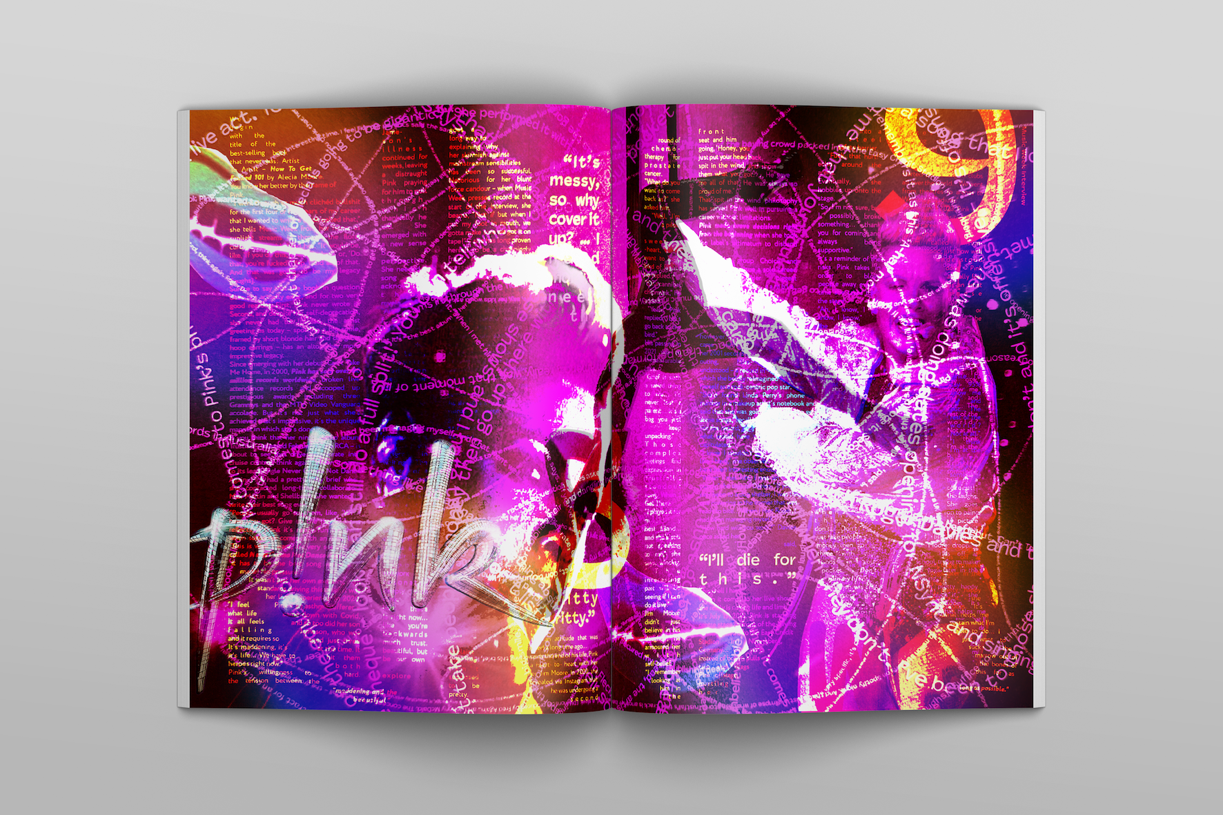 The result is an experimental magazine feature about P!NK that captures the intensity, movement, and emotion of her concerts. Through dynamic layouts and bold visual choices, the design mirrors her performance style, creating a piece that feels just as powerful and alive as the artist herself.